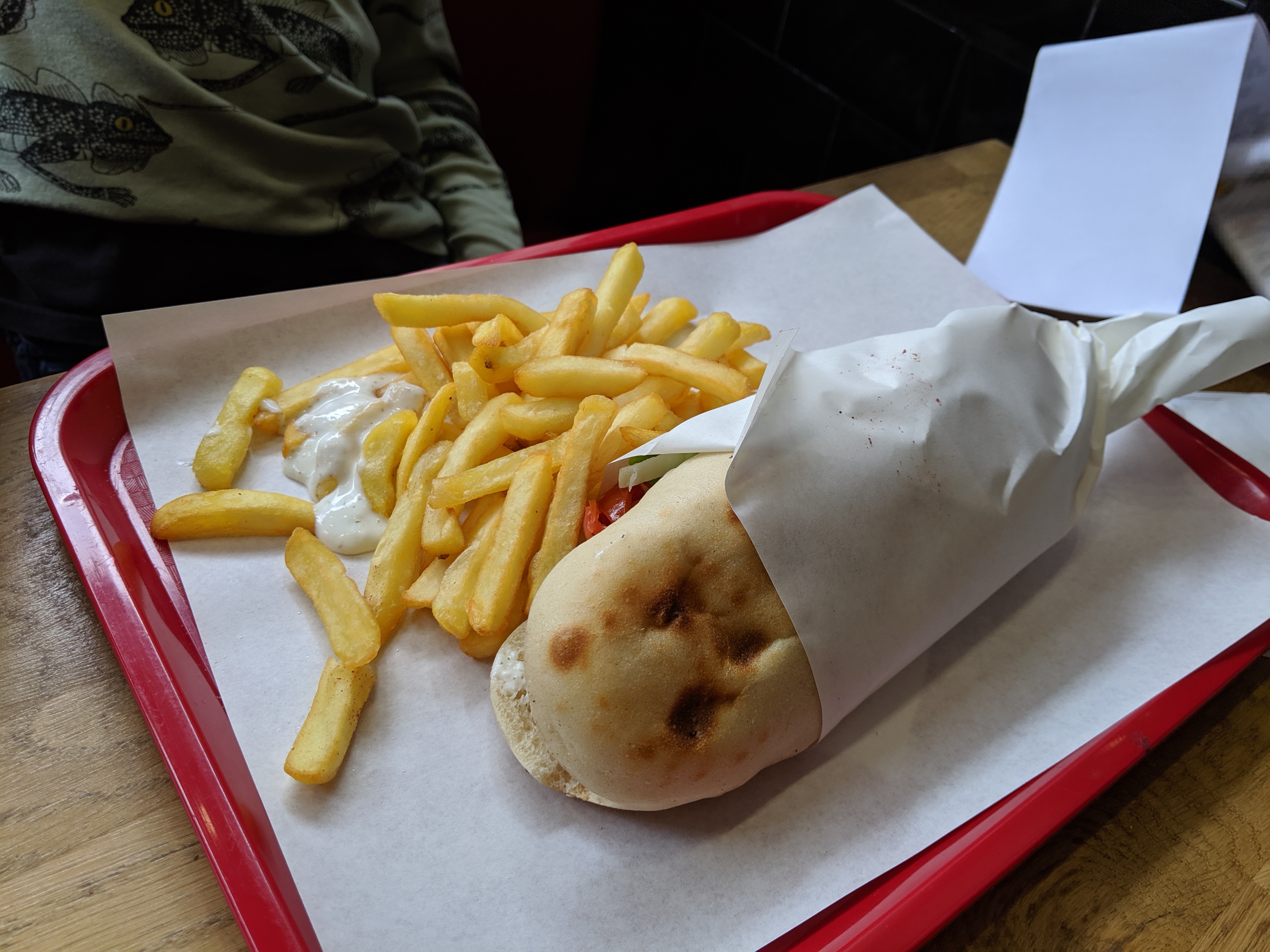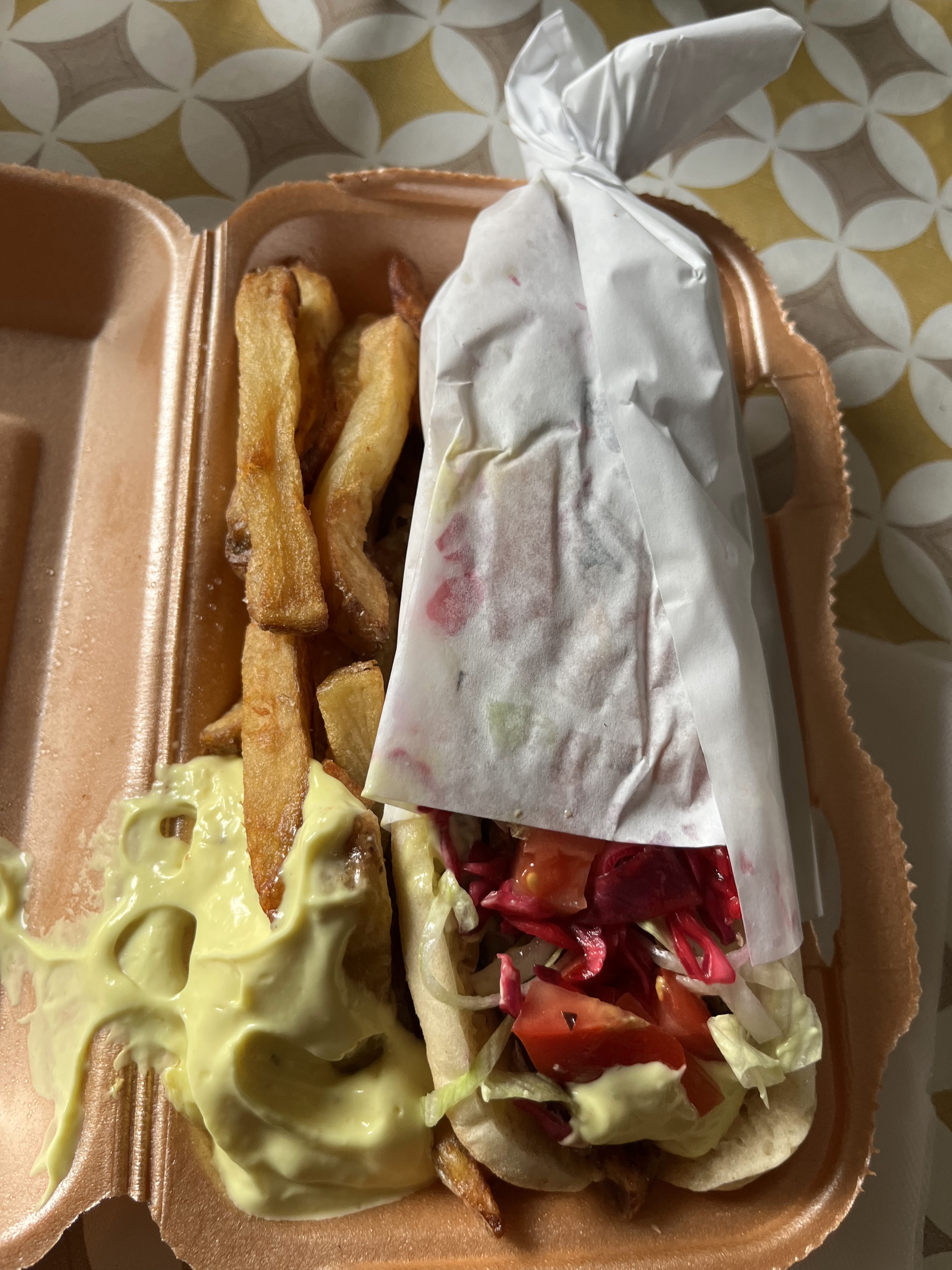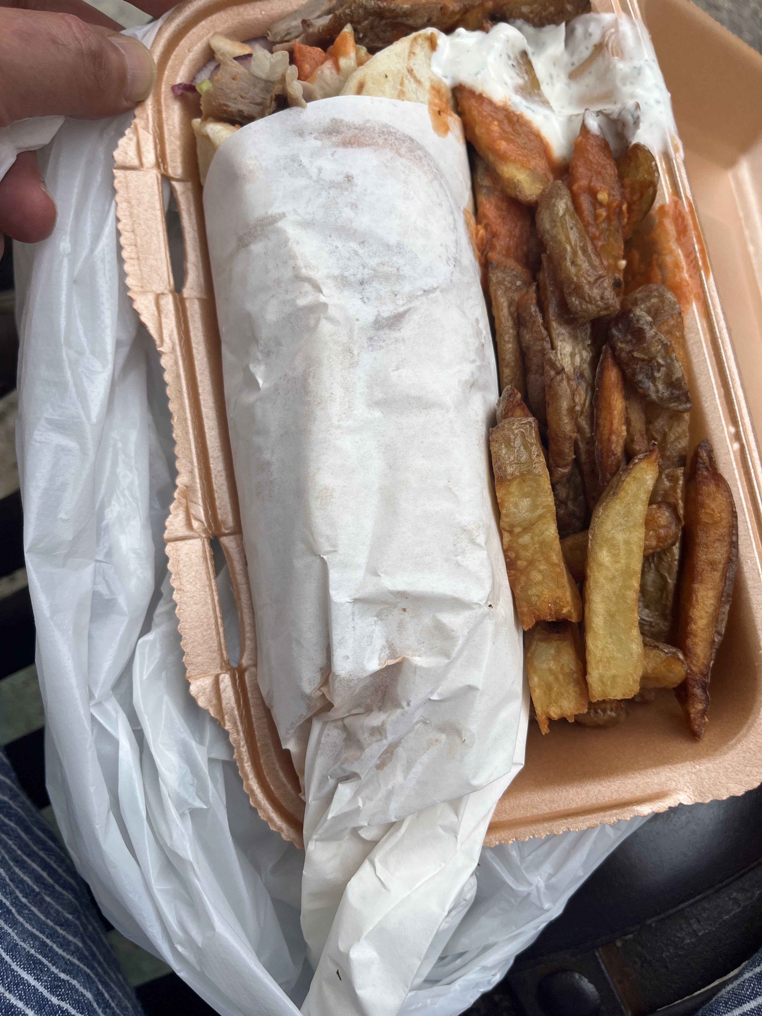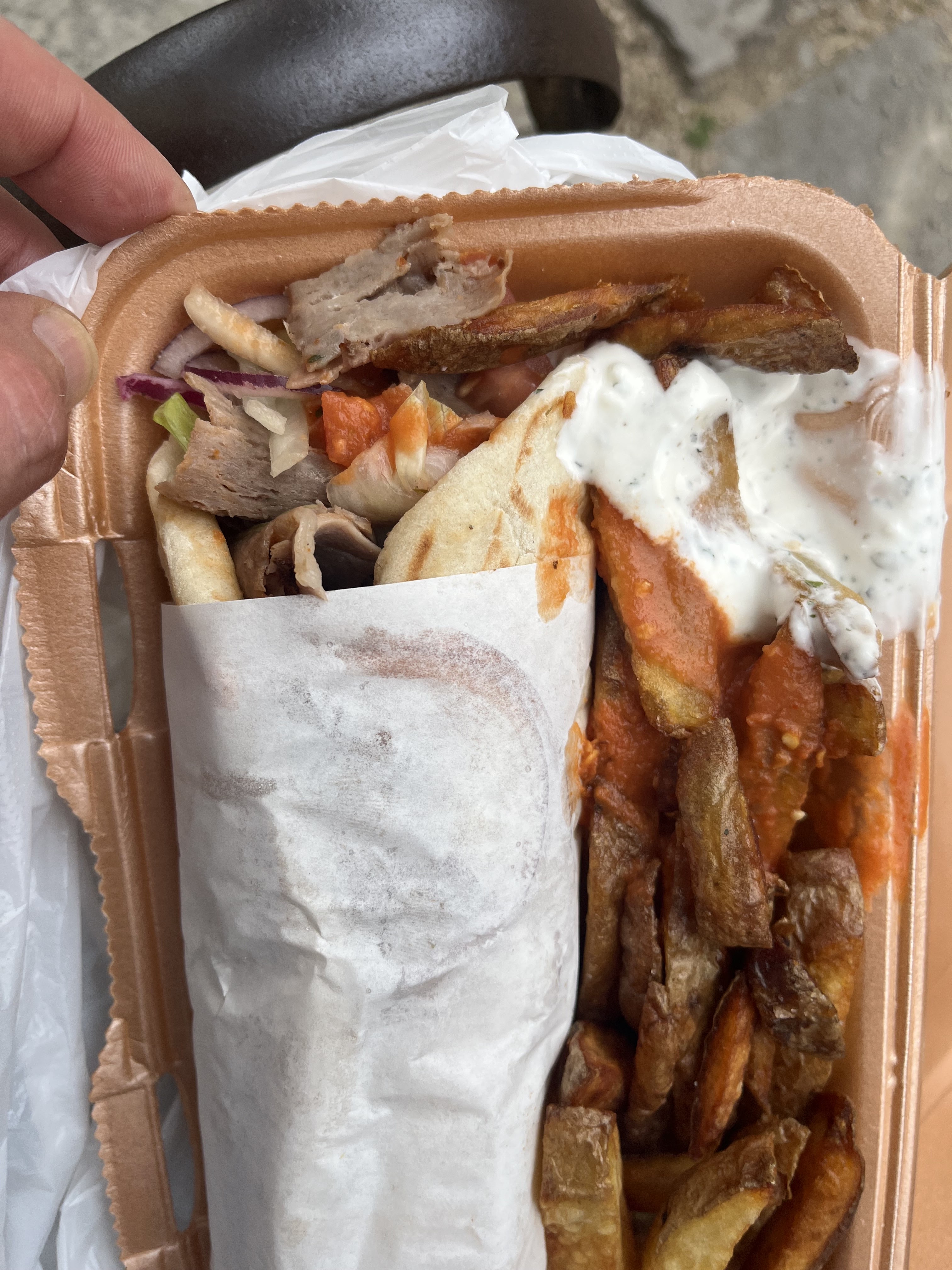 Dé-Li-cieux!! Sandwich grec parfait. Les frites maison font clairement la différence ! Les produits sont frais, la viande hyper bonne avec une sauce blanche à l'aneth 👌🏻👌🏻😍