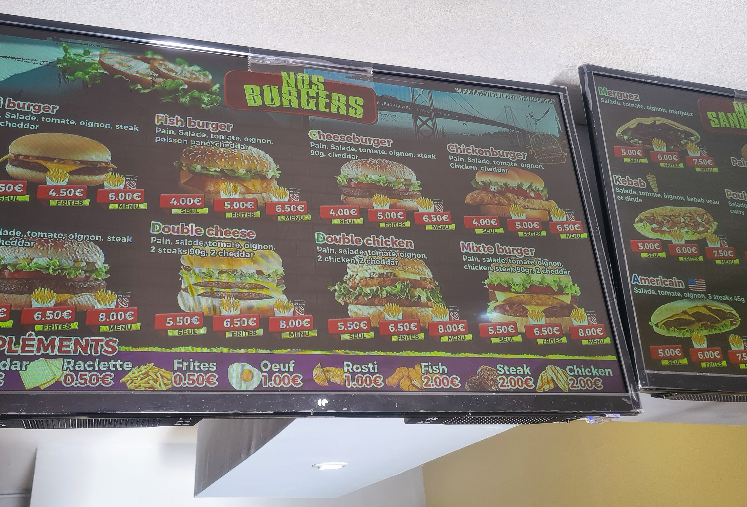 J'ai pris un Tacos 3 viandes mais j'étais septique au début, et finalement grande surprise le tacos était super bon et énorme vraiment (plus gros que ma tête). Sauce fromagère en plus donc super bon, par contre ma copine a pris un americain qui été assez timide, trop de pain pour peu de chose a l'intérieur mais ca va elle a aimé.