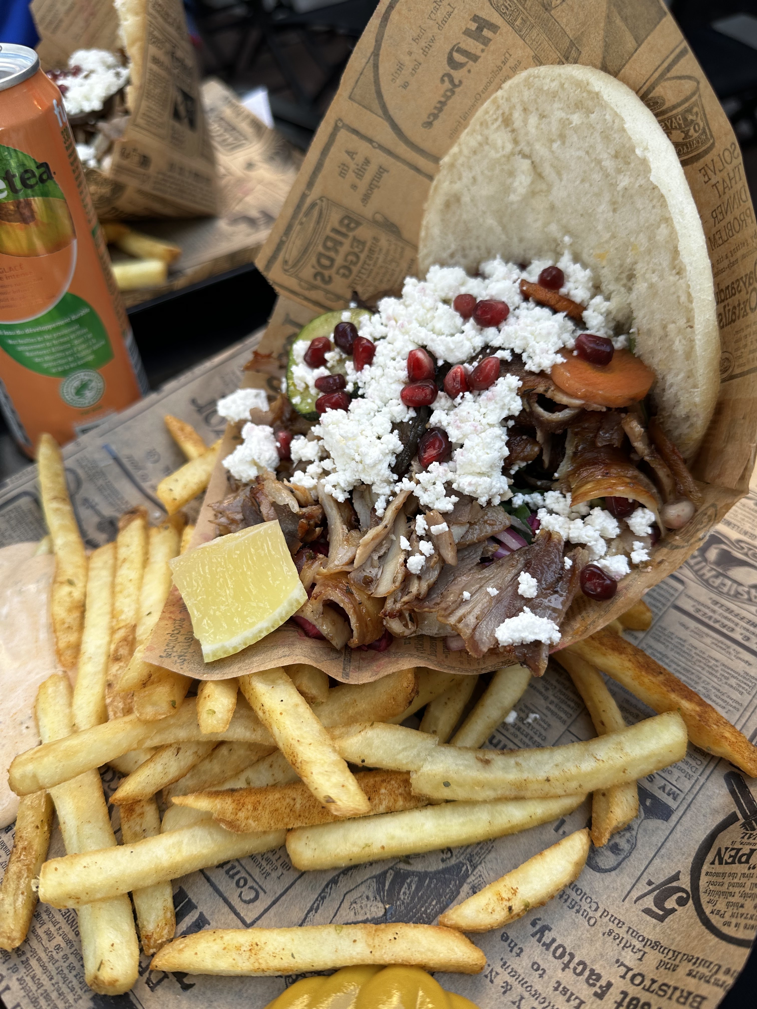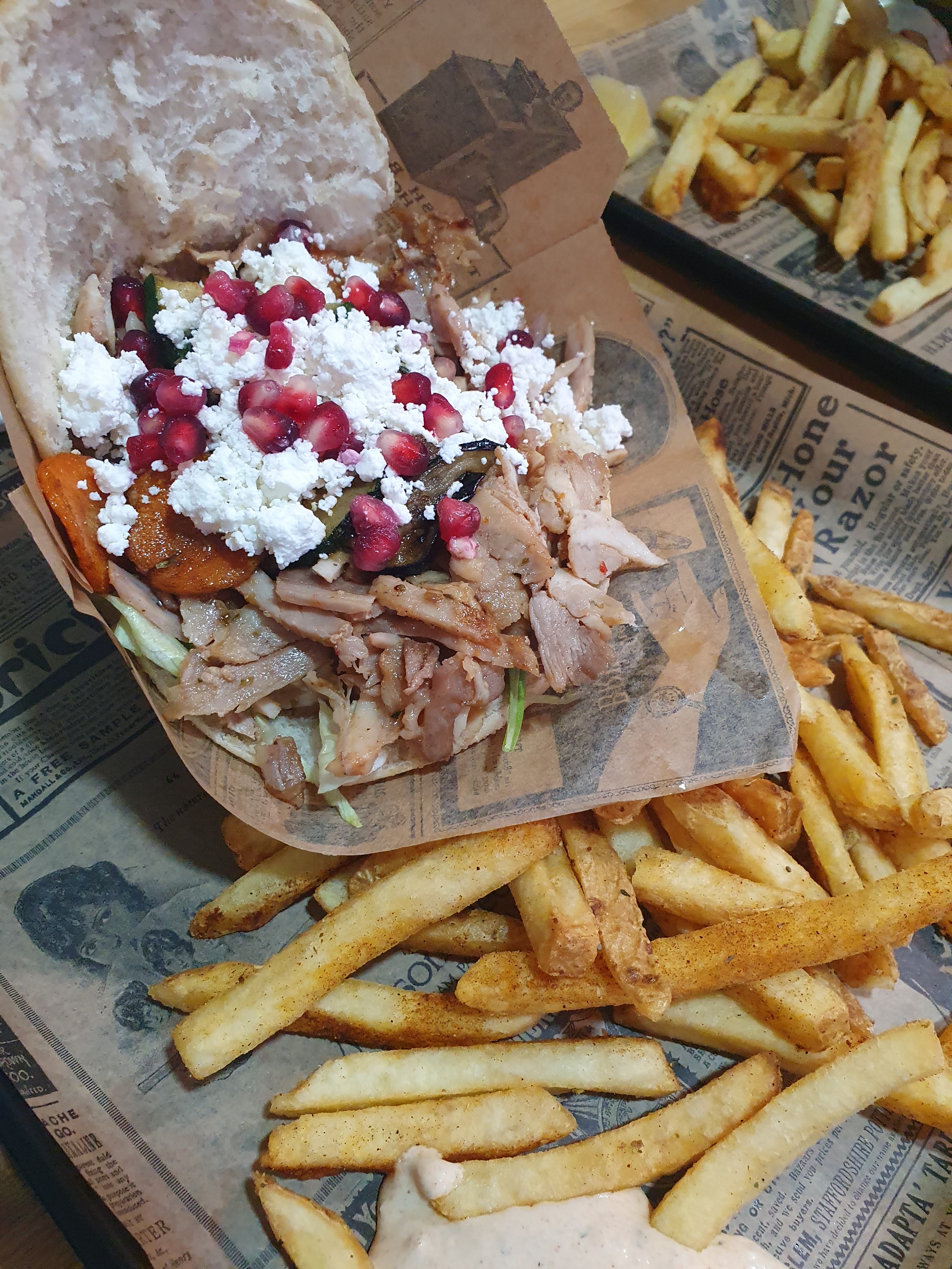 Les pitas et les salades sont délicieuses et les frites , un régal 😋 j’ai adoré la saucée moutarde miel 👍 Deco sympa Équipe accueillante Resto propre Petit bémol, les toilettes sont proche des tables mais c’est par manque de place sûrement. Nous reviendrons quand même 👌
