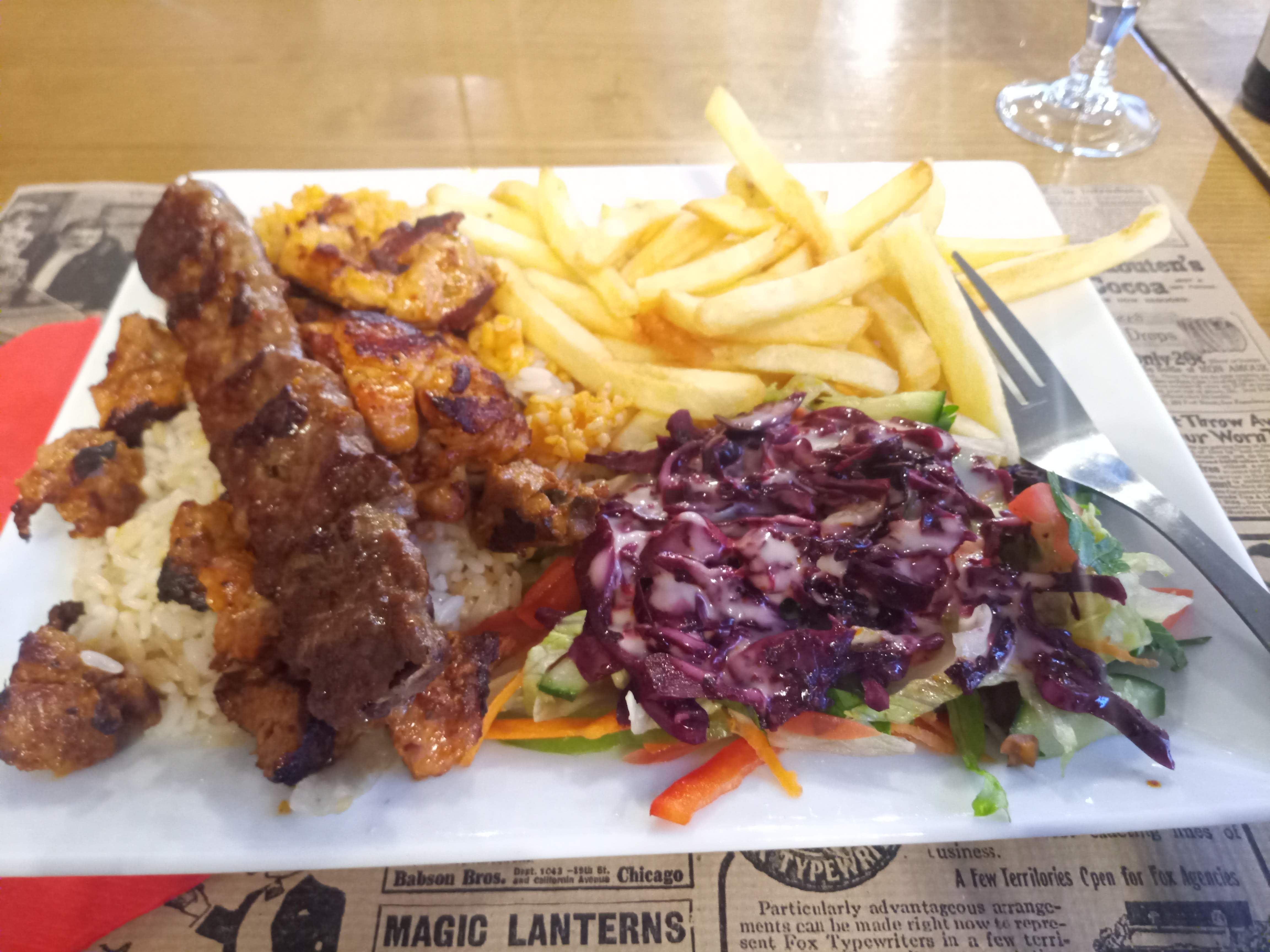 Bonne qualité et prix corrects. Assiette brochettes d'agneau boulgour, riz salade et frites. C'est plein tous les midi.