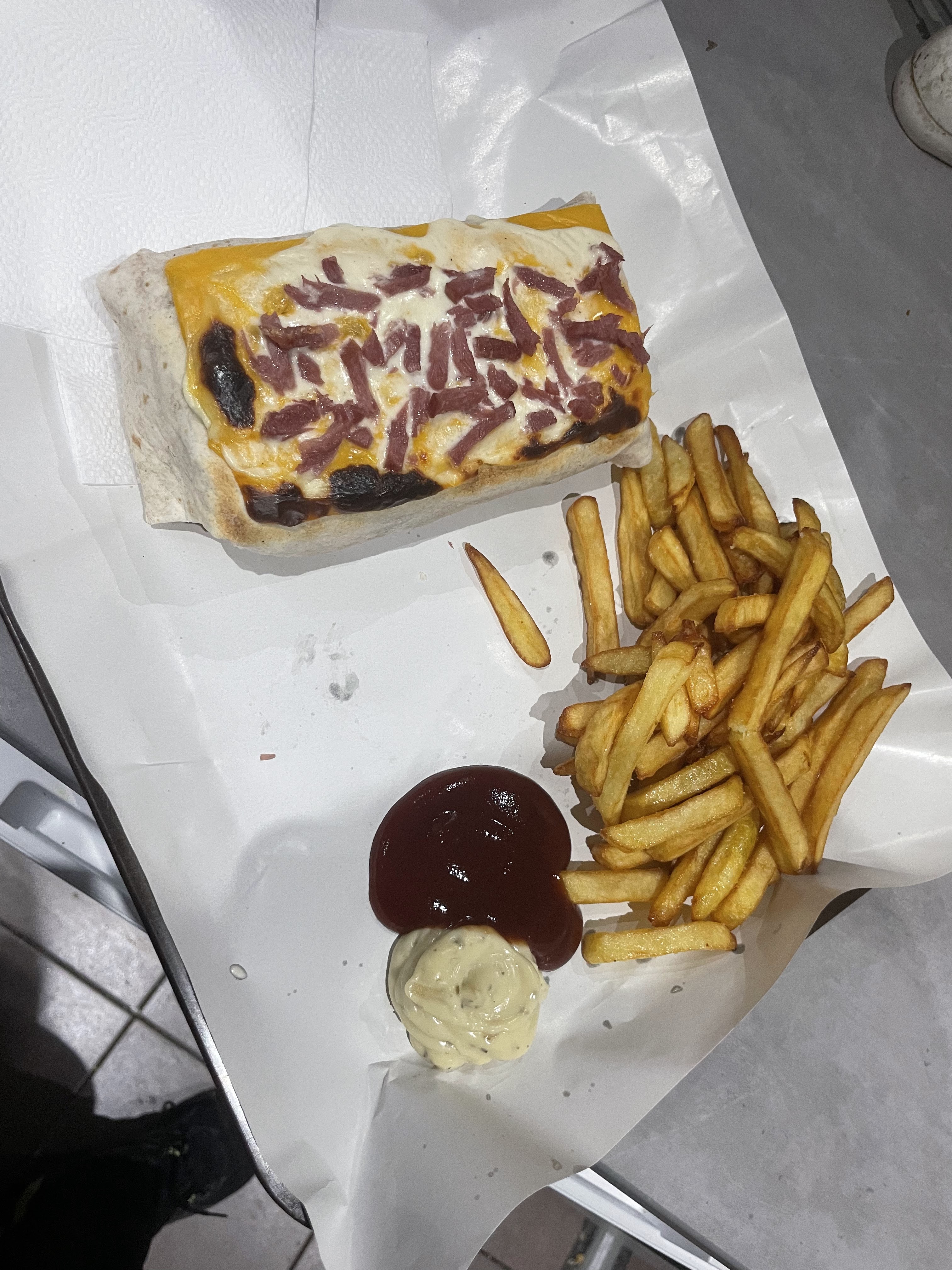Viande trop cuite (sèche). frites môle. Peut de sauce dans le tacos mais beaucoup de frites, pourtant j'ai demandé supplément viande.. Menu enfant pas complet. Les nuggets trop cuite (grillée) le tout pour 35euros. Et c'est pas la première fois. Je recommande pas!