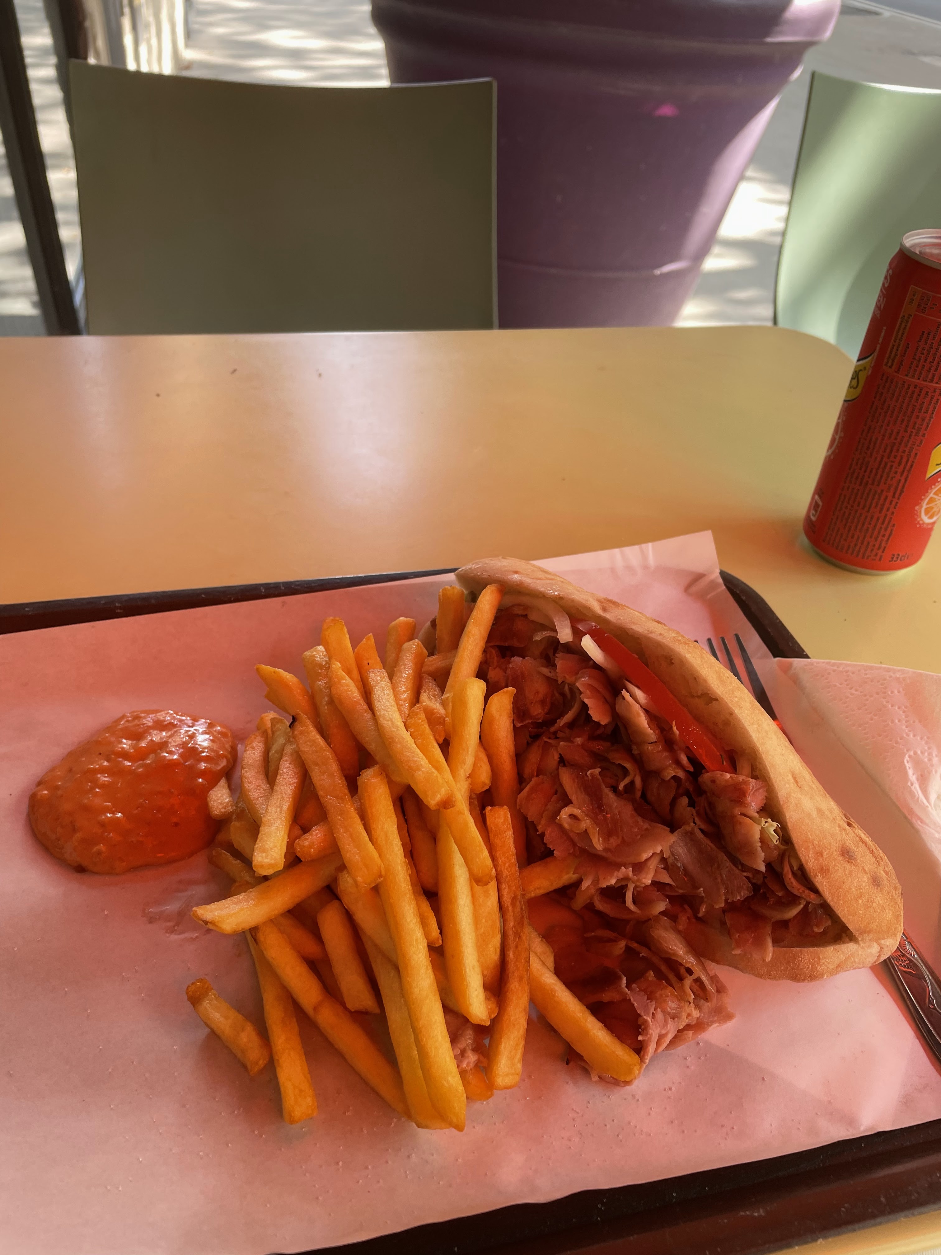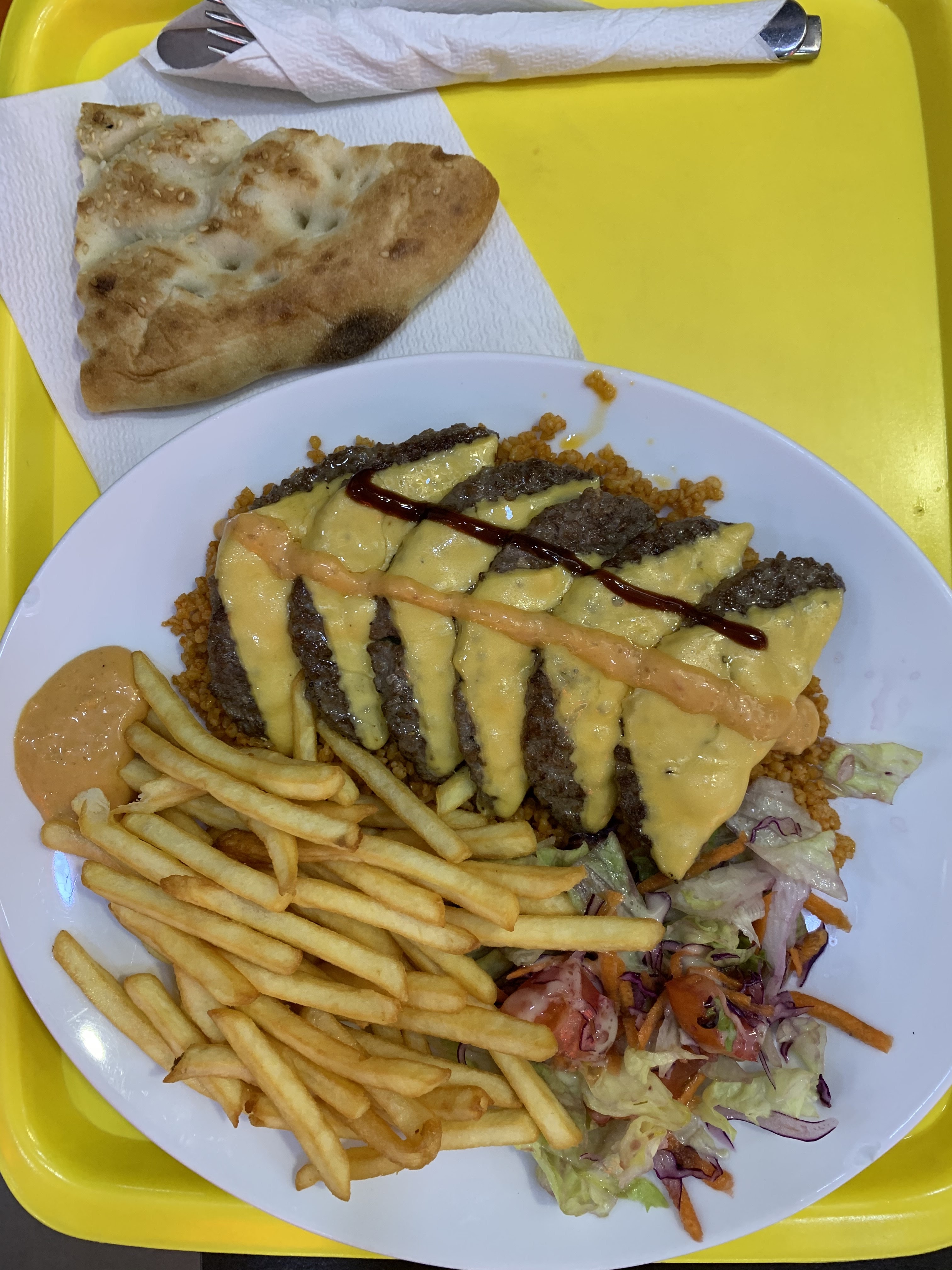 J'ai prit un kebab en sortant de la salle en pensant que ça allé être un kebab basic mais le chef m'as mit une portion de frite pour nourrir une famille de 4 personne, la viande était trop bonne je sais pas si c'est du mouton mais c'était délicieux, je recommande fortement