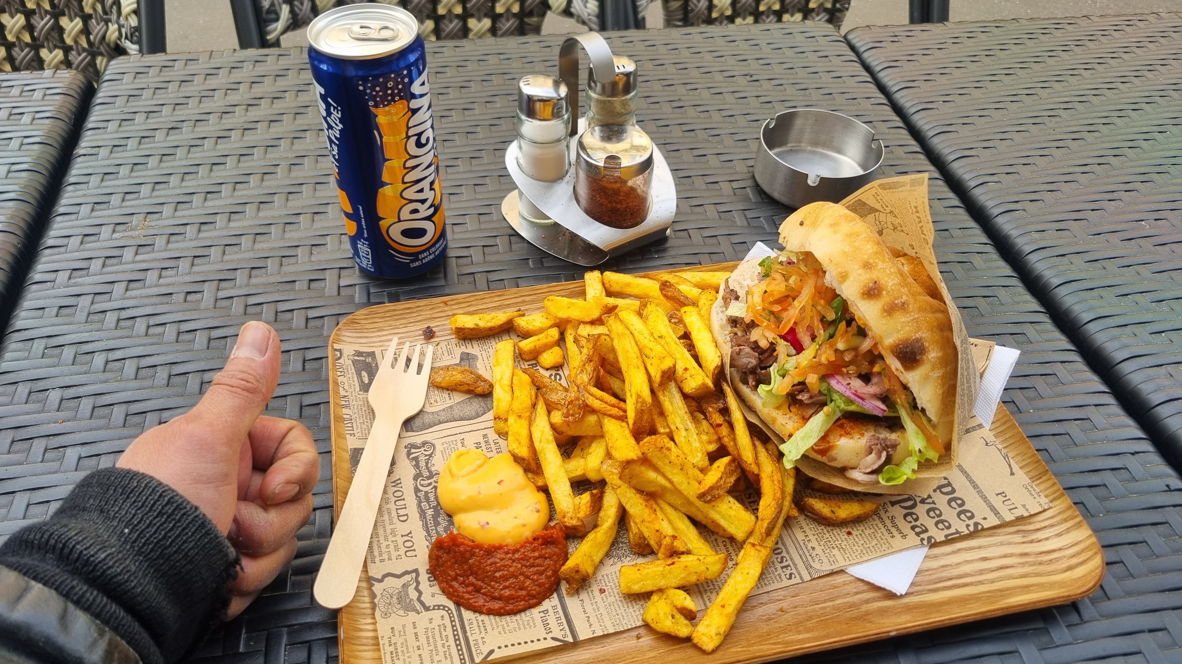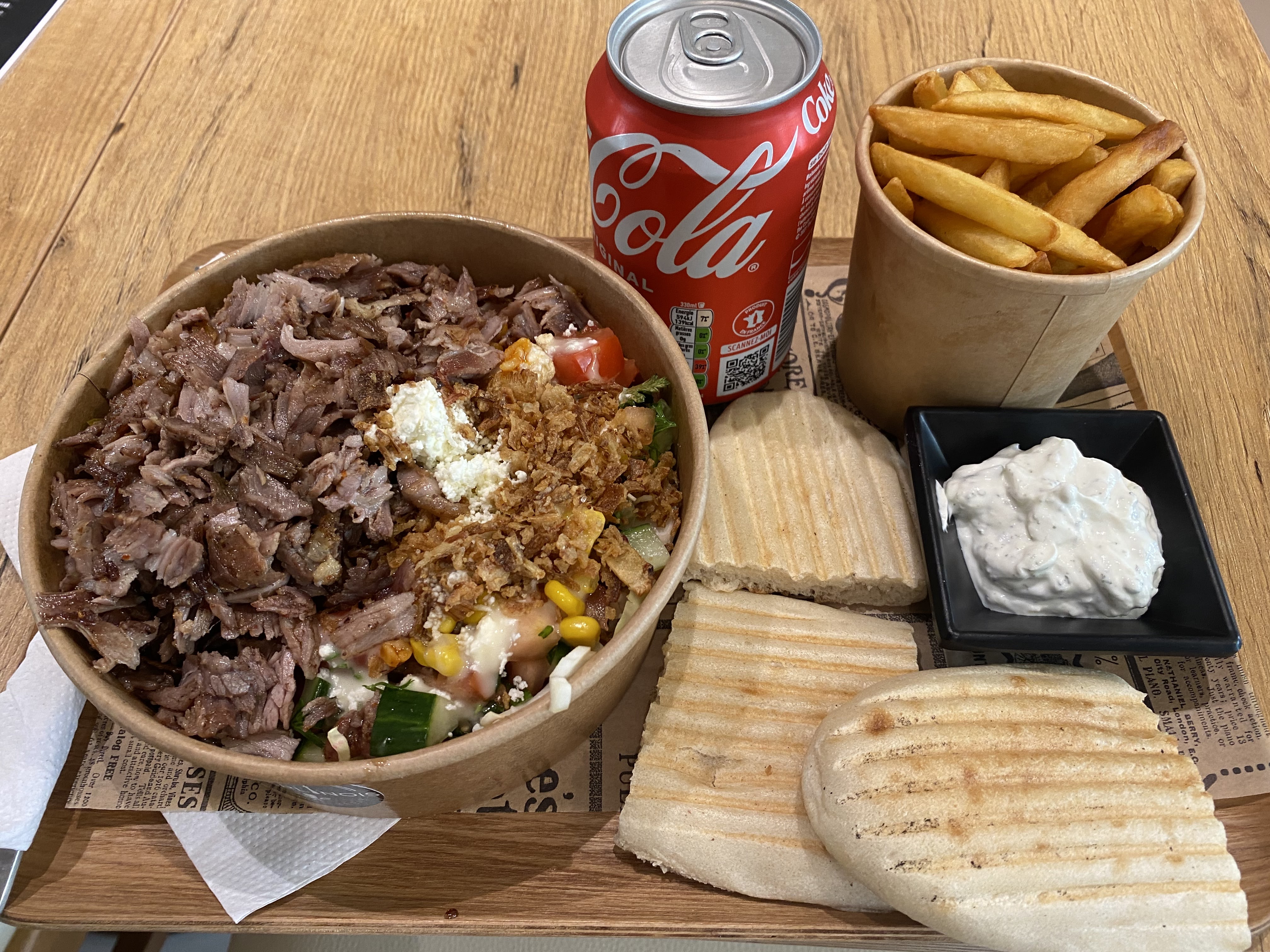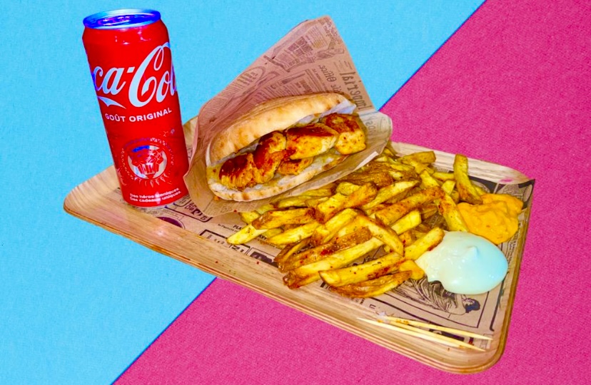 Le chef m’a offert une canette car je lui ai tenu la porte. Un kebab frais et savoureux.