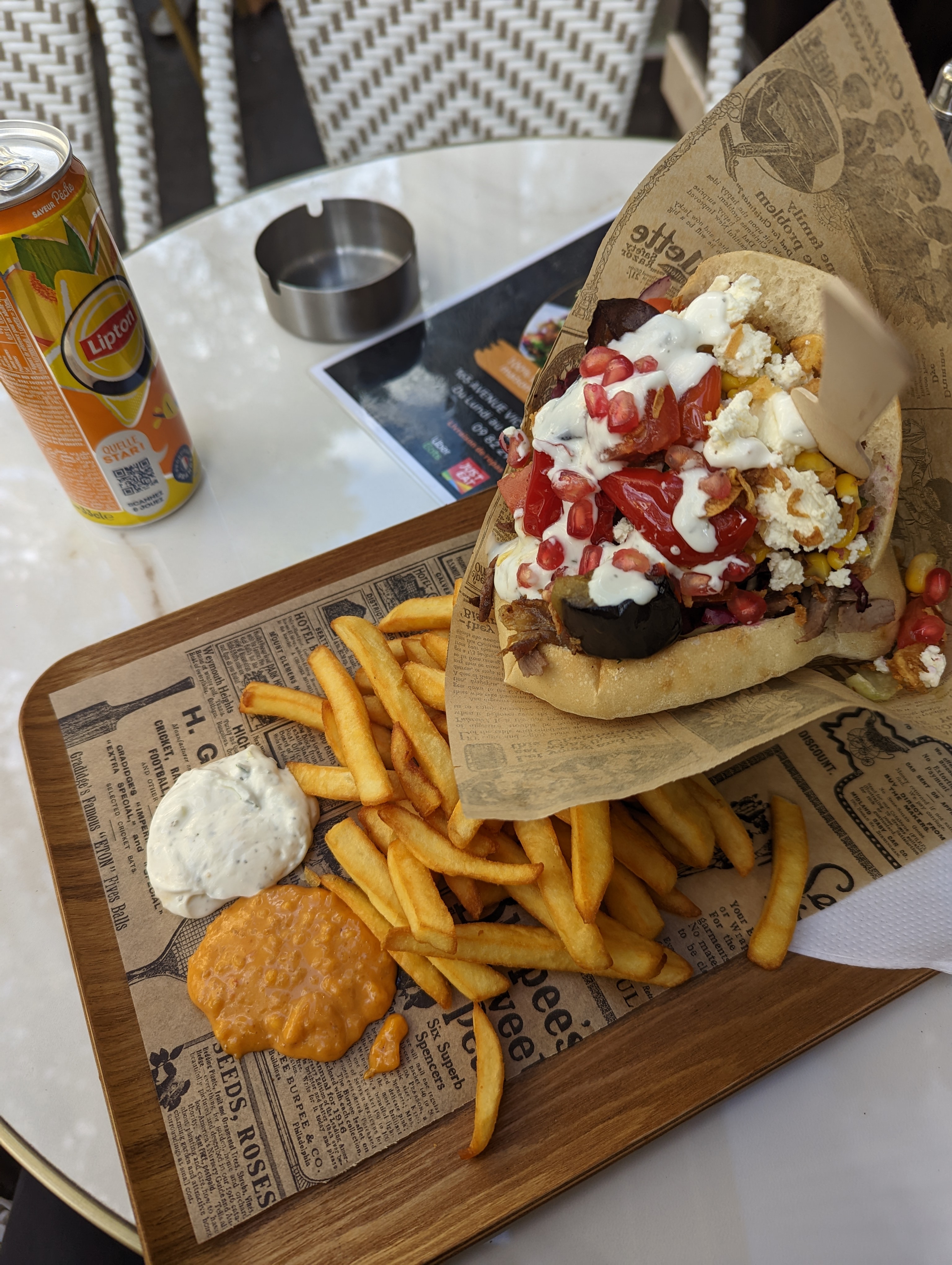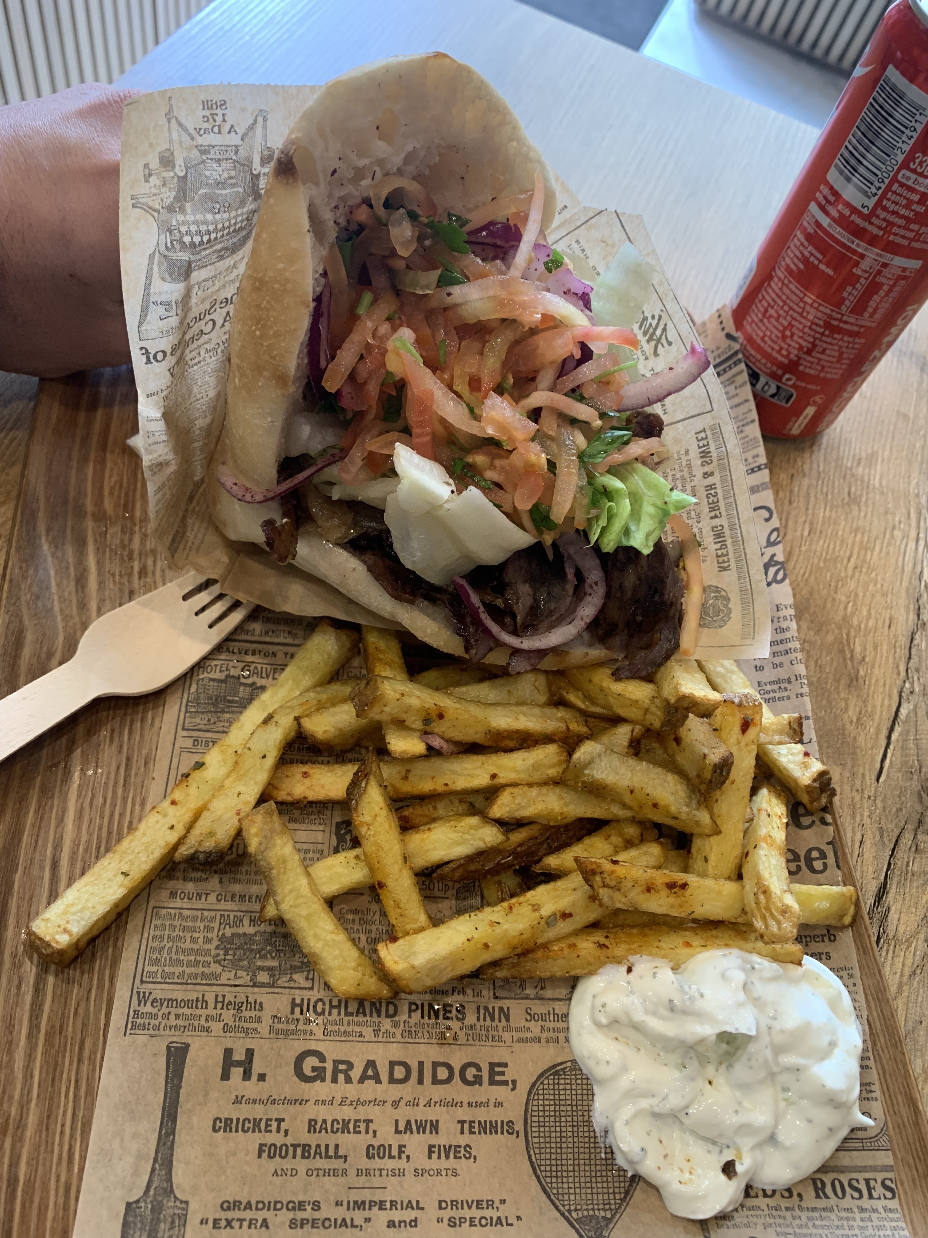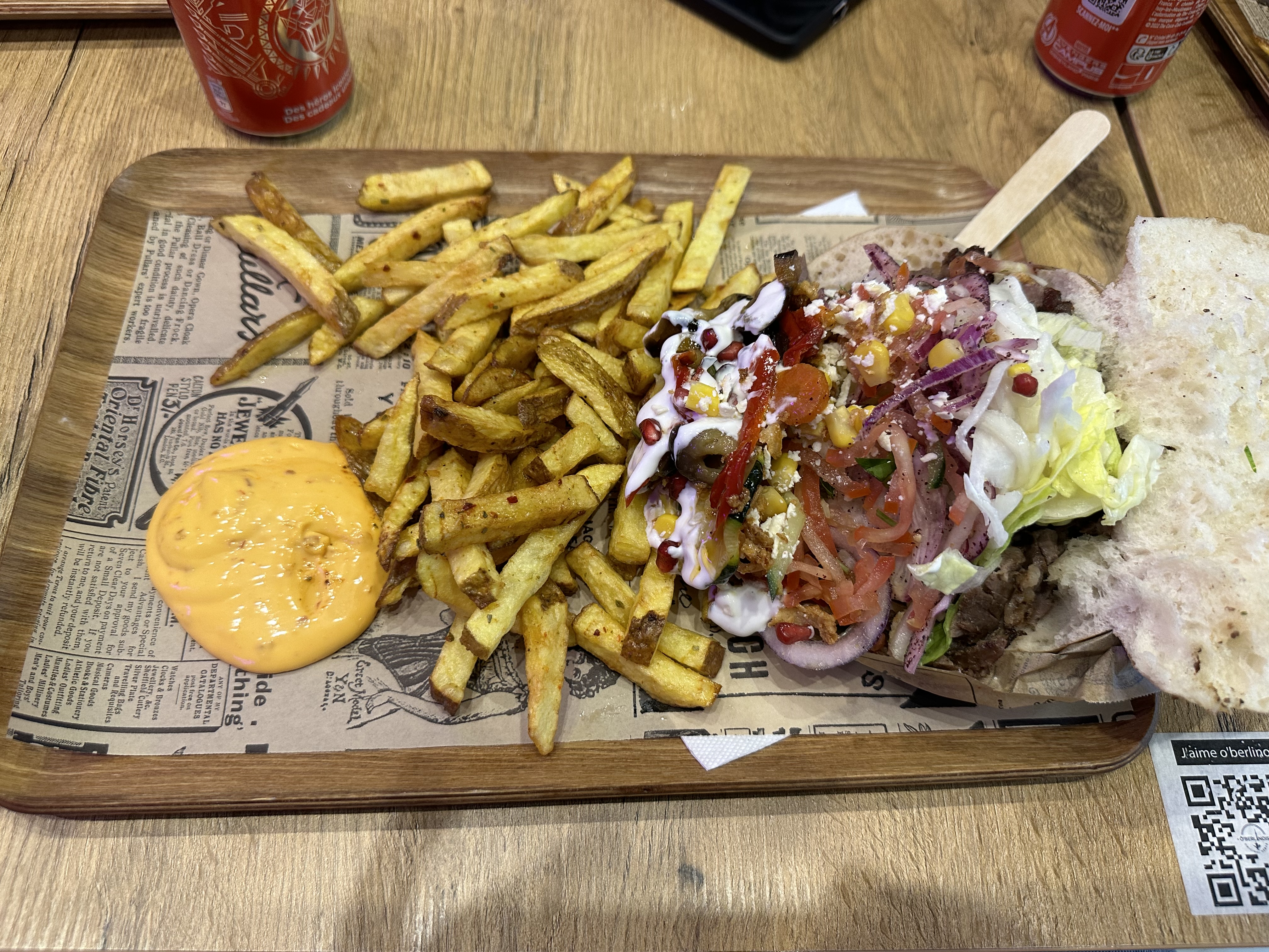Le chef m’a offert une canette car je lui ai tenu la porte. Un kebab frais et savoureux.