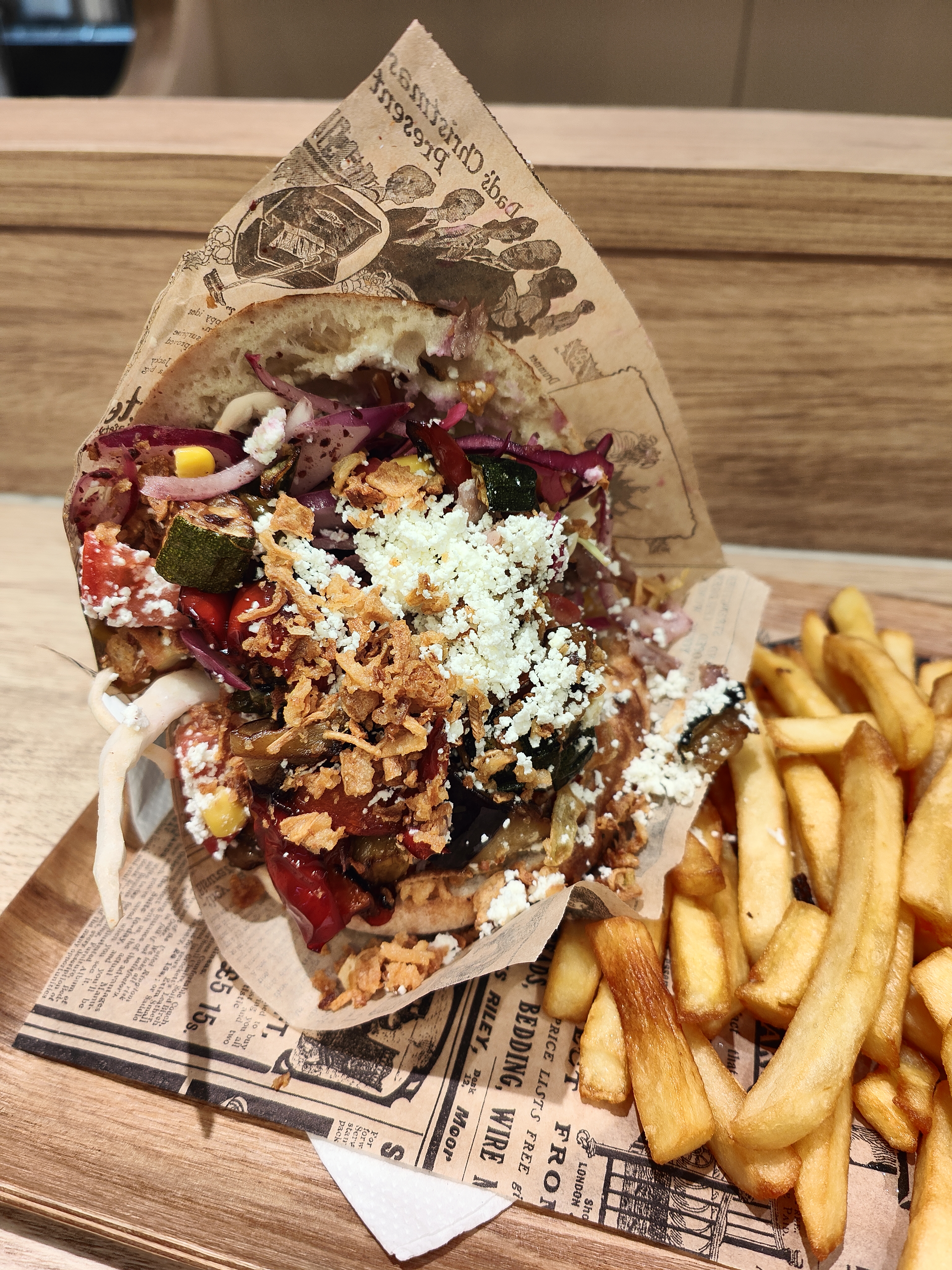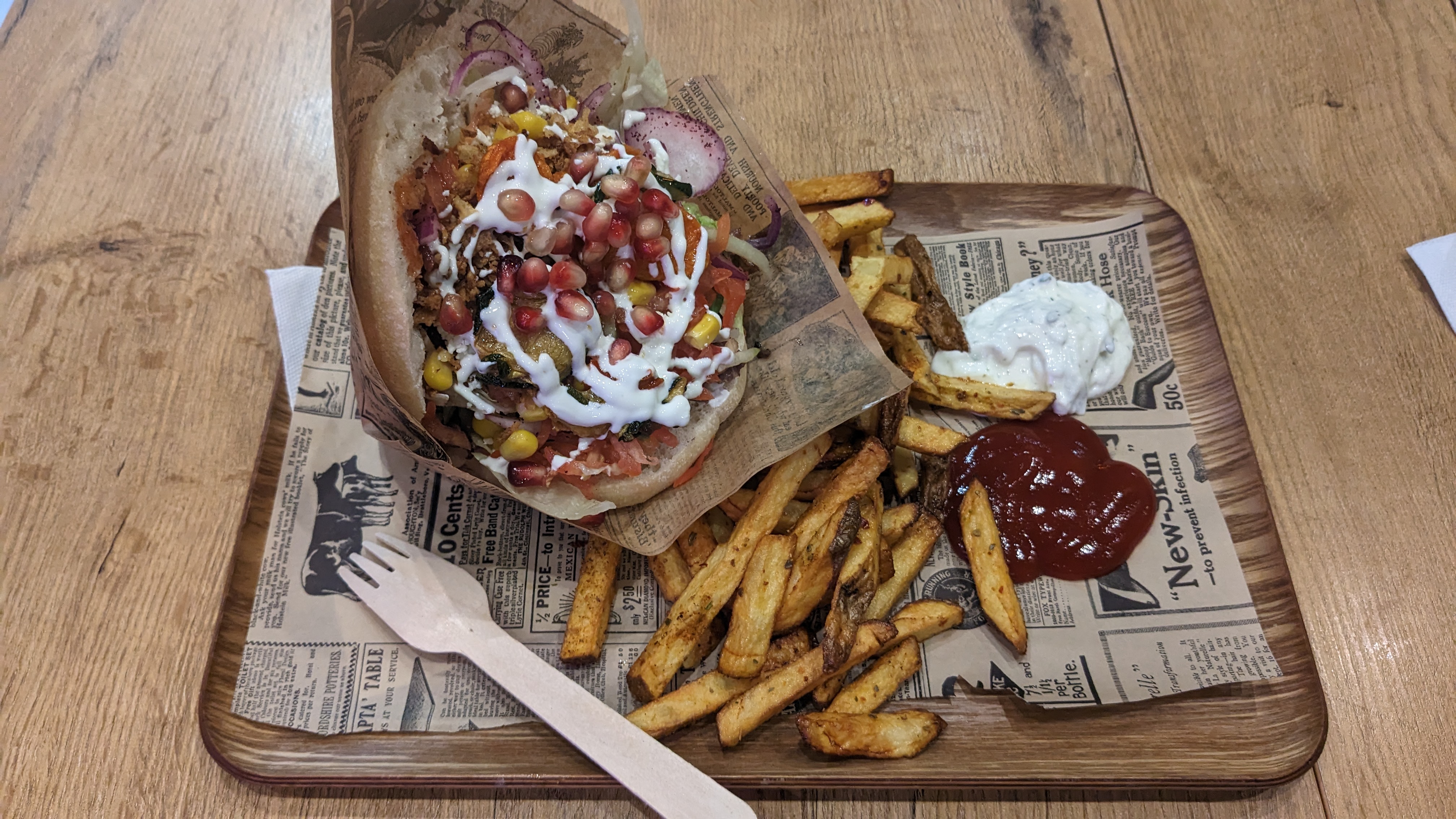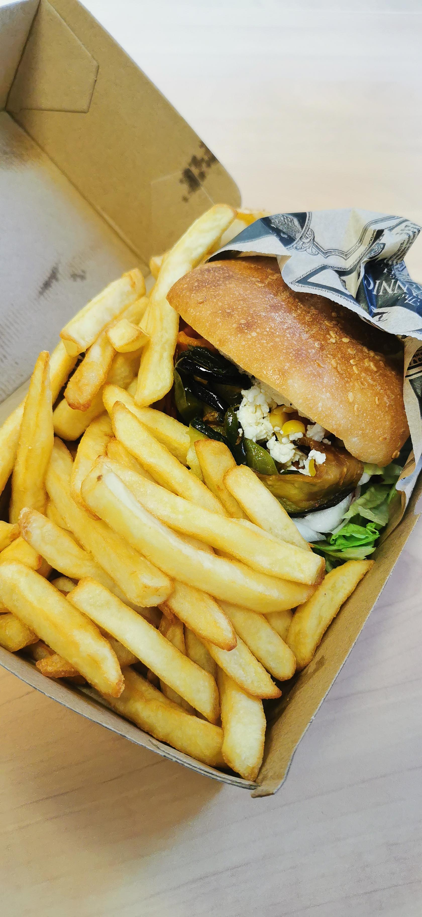 Le sandwich O'berlinois est rempli de légumes, de grenade et de feta, ce qui le rend original et goûteux. Les frites sont excellentes également. L'équipe est très sympa. Il y a une quinzaine de places assises mais c'est très serré à l'heure du dej.