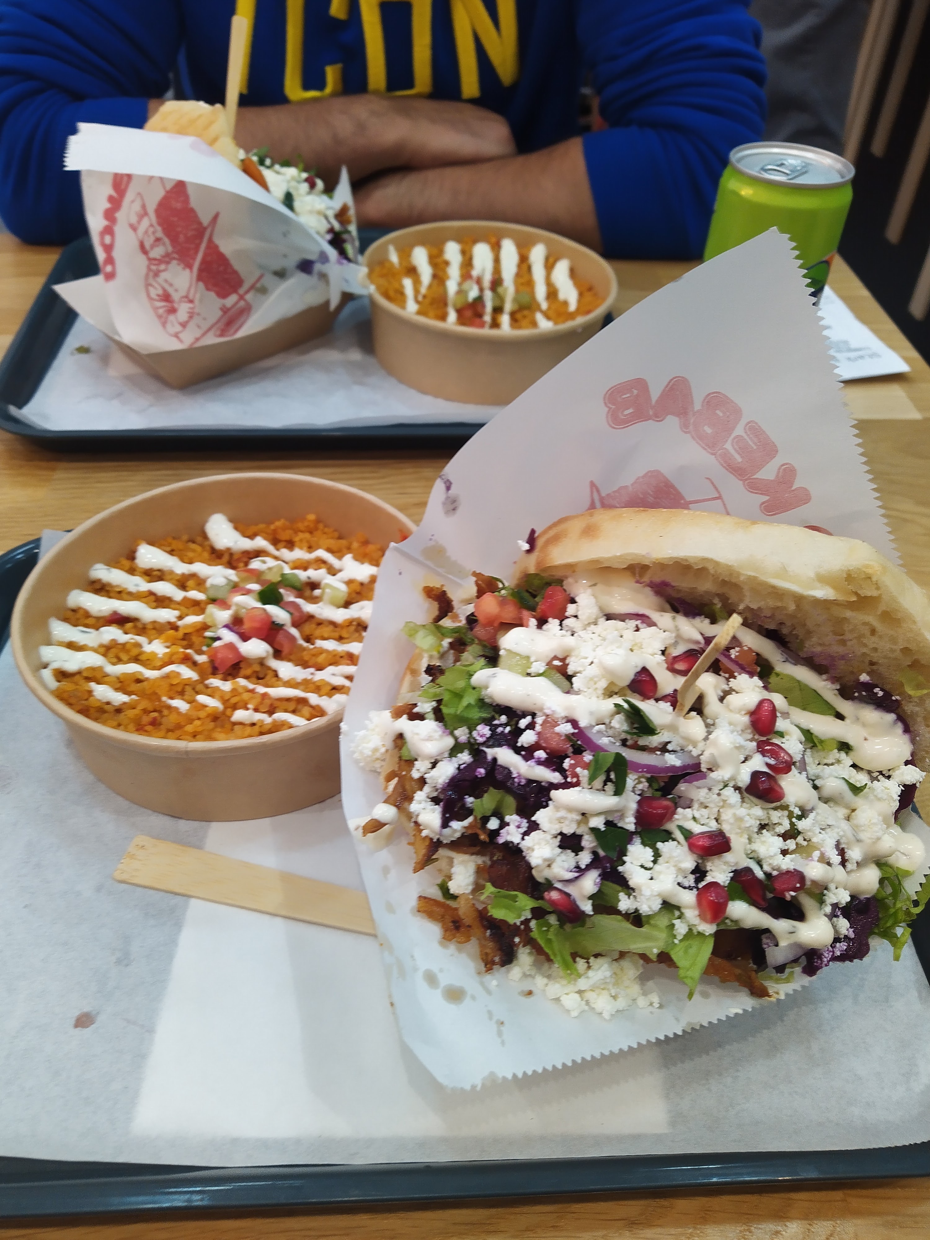 La portion kebab est copieuse, généreusement garnie mais lourde. Les frites étaient décevantes car frites encore et encore dans la même huile, elles paraissent noires et brûlées. Je ne les ai laissés que manger les bons. Mon expérience est donc moyenne en termes de goût. Le service est rapide. Vous pouvez choisir votre trempette. Tenez-vous-en à la salade de boulgour comme accompagnement, c'est un choix plus sain. Vous pouvez ajouter une boisson et un dessert dans le menu.